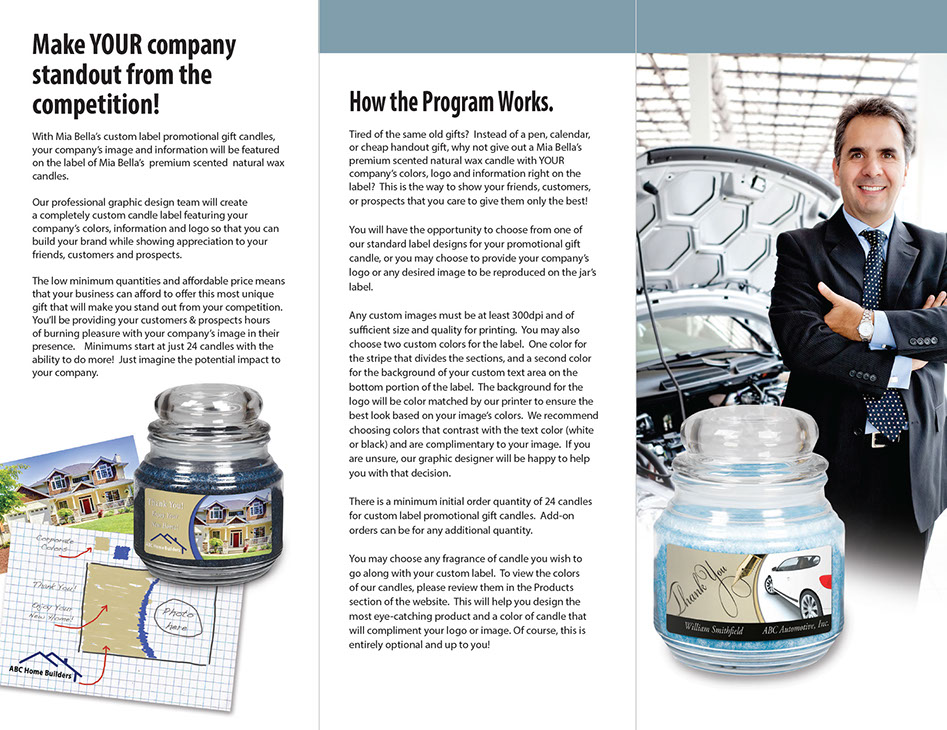 Description: Mia Bella's "Promotional Gift Candles" brochures are 8.5" x 11" brochures folded to 8.5" x 3.5" trifolds. Available in quantities of 50, 100 and 250 brochures. Mia Bella's brochures are printed on white 100# gloss coated stock with high gloss coating. Orders ship within 2-3 business days from order. Shipping times vary by location.